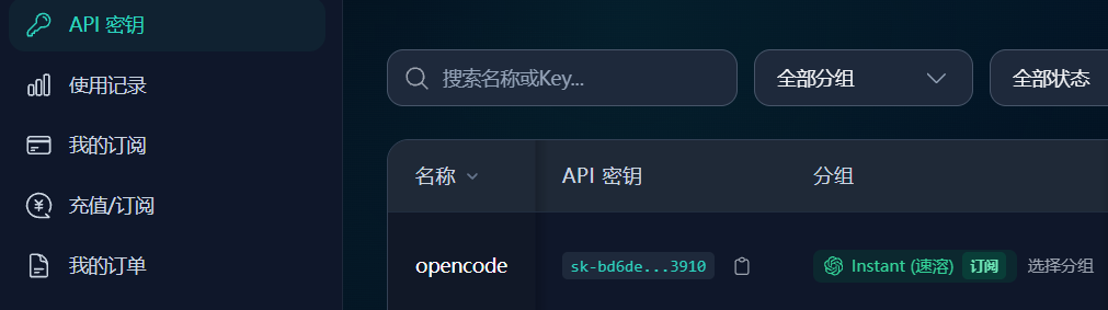 然后就配置好了,输入 opencode 进行启动,测试一下模型能不能用,可以去中转站看看有没有使用记录。